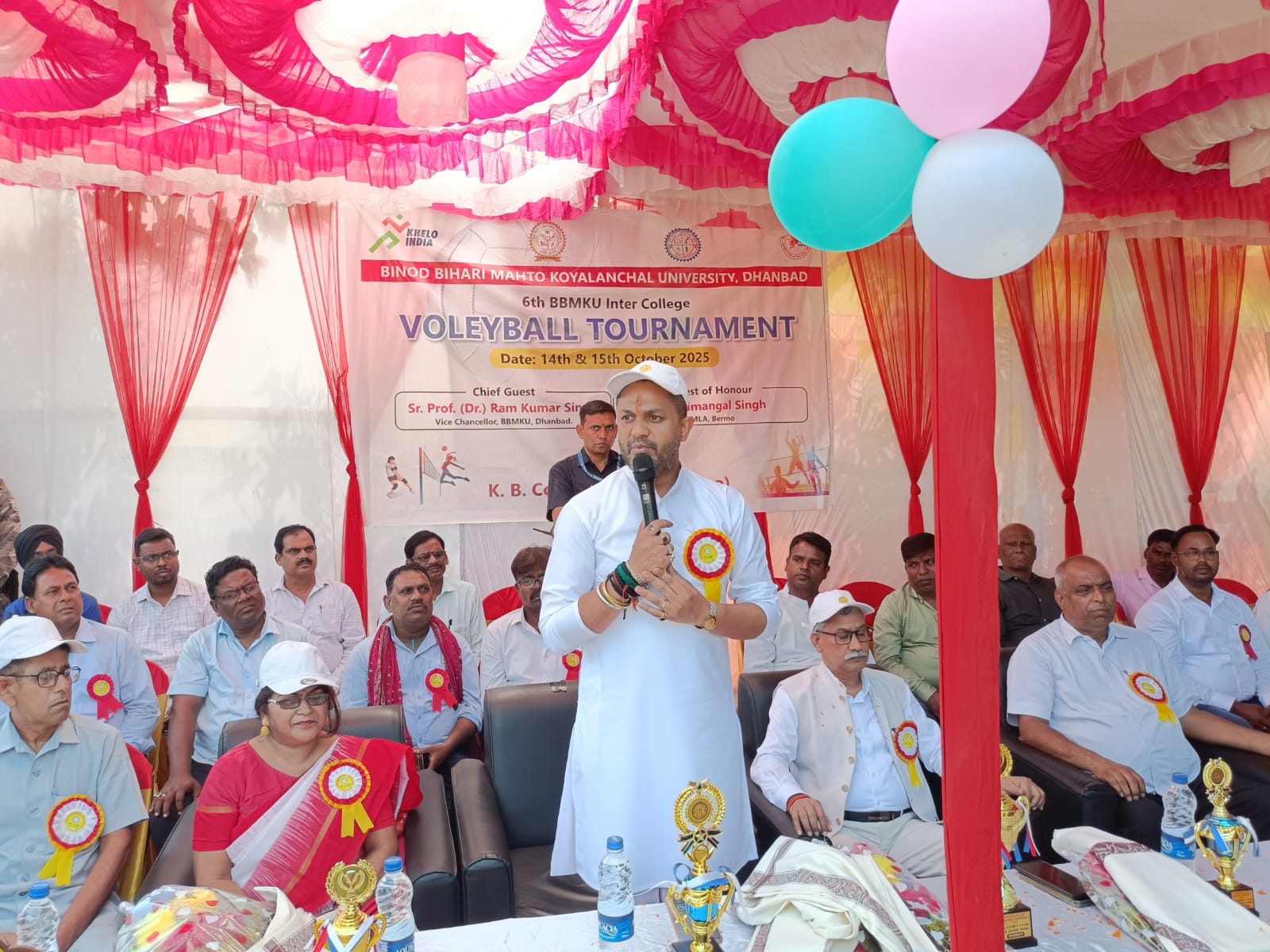 कथारा (बेरमो): विनोद बिहारी महतो कोयलांचल यूनिवर्सिटी धनबाद के केबी कॉलेज बेरमो की मेजबानी में दो दिवसीय छठा अंतर महाविद्यालय वॉलीबाल टूर्नामेंट 2025 की शुरुआत प्राचार्य लक्ष्मी नारायण की अध्यक्षता में मंगलवार को शुरू हुई। कार्यक्रम की शुरुआत मुख्य अतिथि विधायक बेरमो जय मंगल सिंह ने किया। जयमंगल सिंह ने कॉलेज परिसर में शौचालय ब्लॉक एवं अतिथि शाला का उदघाटन किया। कहा बेरमो क्षेत्र का यह कॉलेज छात्र छात्राओं के सर्वांगीण विकास में बढ़ चढ़ कर अपनी भूमिका का निर्वहन कर रहे हैं। हजारों छात्र डिग्री प्राप्त कर रहे हैं और पढ़ाई का बेहतर माहौल इस कॉलेज में देखा जाता है। इसके साथ छठा अंतर महाविद्यालय वॉलीबाल टूर्नामेंट 2025 कार्यक्रम में विनोद बिहारी महतो कोयलांचल यूनिवर्सिटी धनबाद के कुलपति वरीय प्रोफेसर डॉ राम कुमार सिंह की गरिमामय उपस्थिति रही। वालीबॉल टूर्नामेंट के मुख्य अतिथि कुलपति डॉ राम कुमार सिंह एवं विशिष्ट अतिथि विधायक जय मंगल सिंह रहे।
